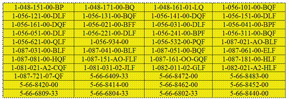 Westinghouse: DI062-F, DI104-F, DI135-F, DI167-F, DI198-F, DI239-F, TM83,, TM1035, TM1355, TM1665, TM1985, TM2311, TM3014.